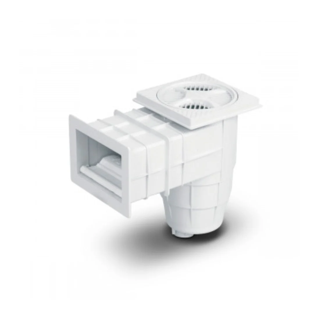 Toma superficial de agua para piscinas de hormigón con boca de 20cm de ancho y cuello de 235cm de largo. Dispone de conexiones con uniones dobles; con bujes de rosca hembra 1 1/2” para caños de polipropileno y lisos de ø 50mm para pegar caños de PVC. Los skimmers garantizan una superficie libre de impurezas, favoreciendo al mismo tiempo al movimiento y filtrado del agua de la piscina.